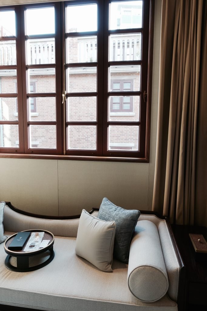 Design-wise, the interiors blend heritage details with modern luxury. Dark wood furnishings, soft neutral tones, silk textures, and contemporary lighting create a refined balance between old Shanghai aesthetics and modern comfort.