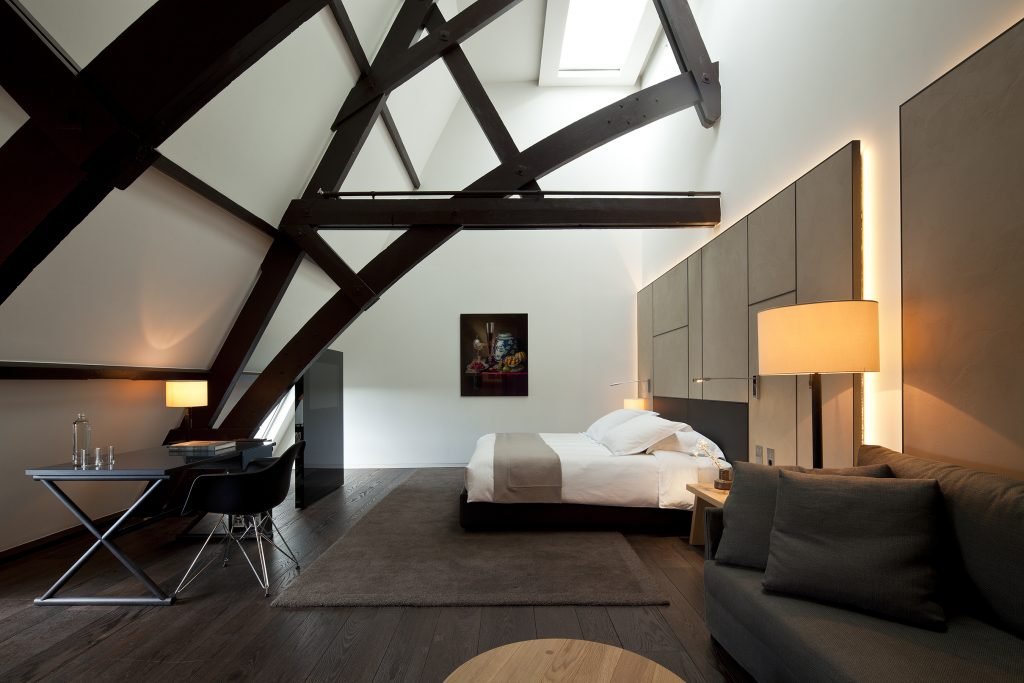 Some rooms even feature duplex layouts or high ceilings, adding a sense of architectural openness rarely found in city hotels. The furniture is understated but luxurious, with carefully selected materials like leather, wood, and stone.
