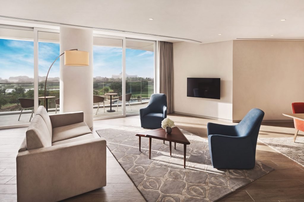Accommodations are notably large, with layouts that often include separate living areas, walk-in wardrobes, and generous balconies. Many rooms overlook either the golf course, lake, or landscaped resort surroundings, reinforcing the feeling of openness.