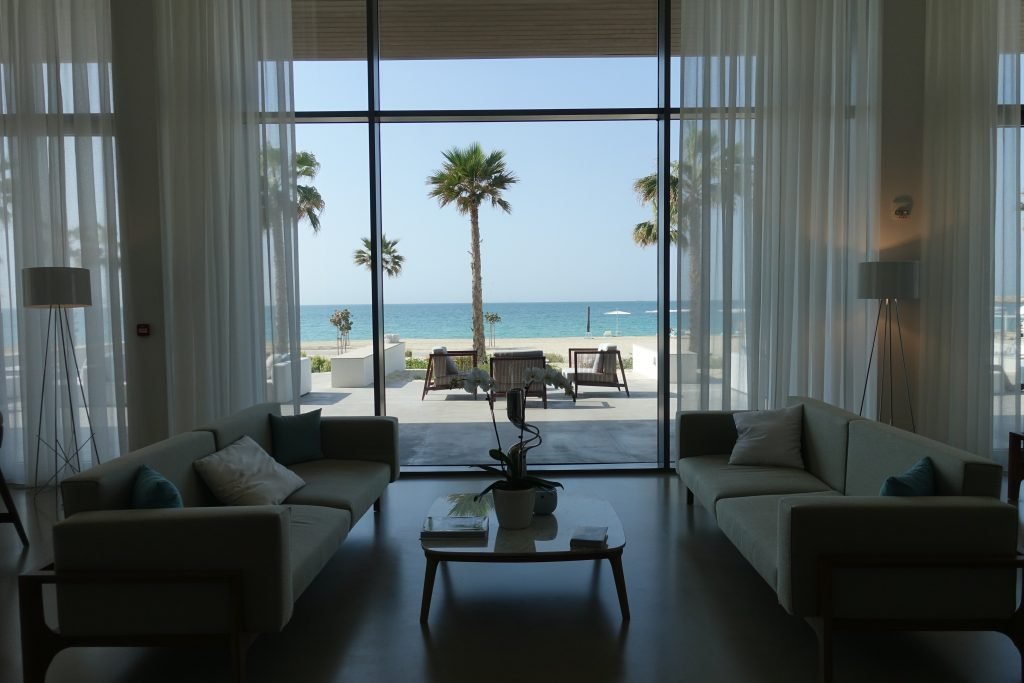A soft white and neutral palette dominates the interiors, complemented by natural textures and subtle coastal accents. Floor-to-ceiling windows are a key feature, allowing natural light to flood the space while framing views of either the Arabian Gulf or the resort grounds.