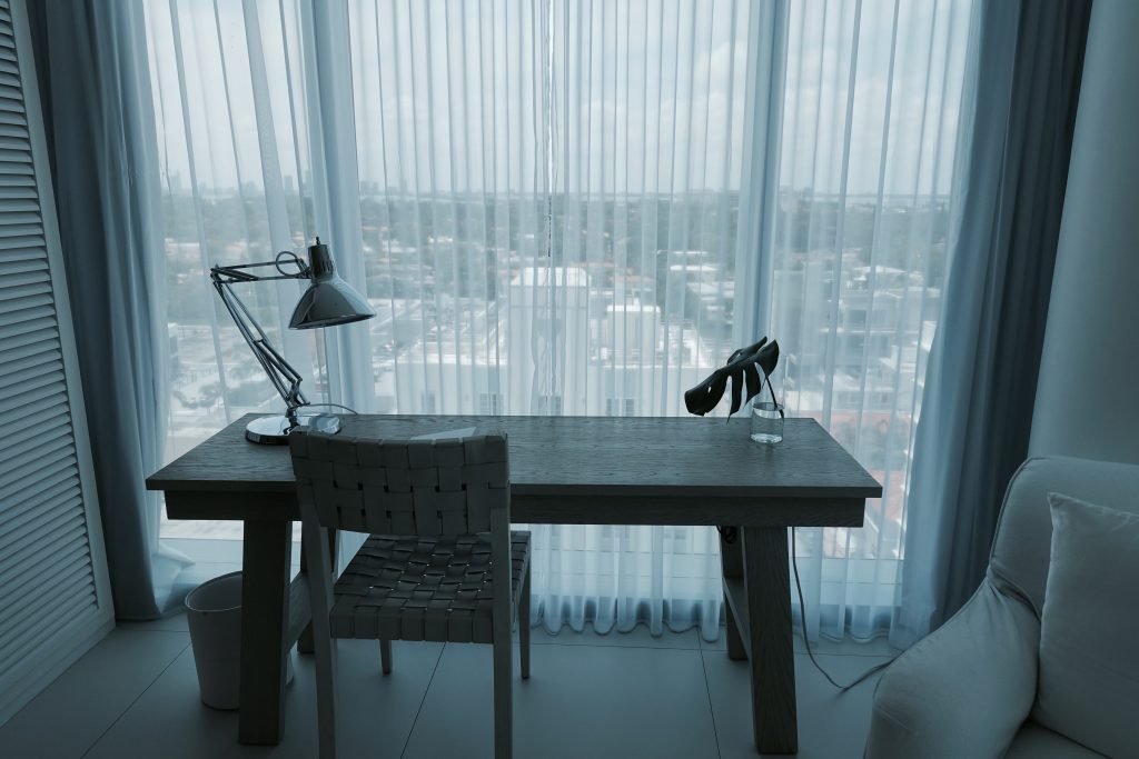 Inside, the aesthetic is dominated by light tones: white walls, pale wood finishes, and soft neutral textiles. The effect is airy and beach-inspired, echoing Miamiโs natural surroundings.