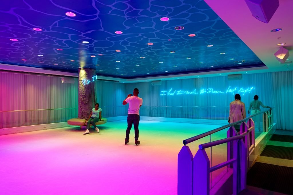 One of its most distinctive features is its underground entertainment space, which includes a bowling alley, ice-skating rink, and nightclub. This unexpected combination adds a playful edge to the property and sets it apart from more conventional beachfront resorts.